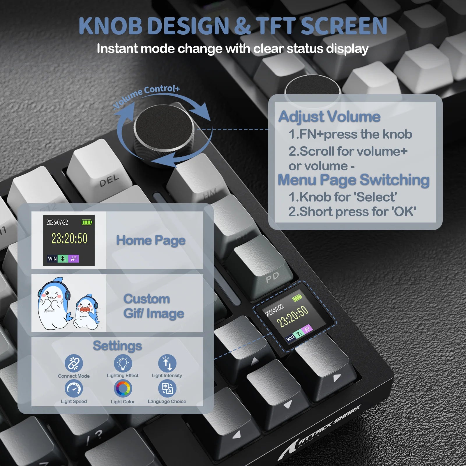 • 【Smart TFT Display & Metal Control Knob】Upgrade your setup with a vivid TFT smart screen and precision knob for real-time control. Instantly adjust RGB, switch OS modes, check battery, or view date and connection status—all with visual feedback and intuitive tactile control.